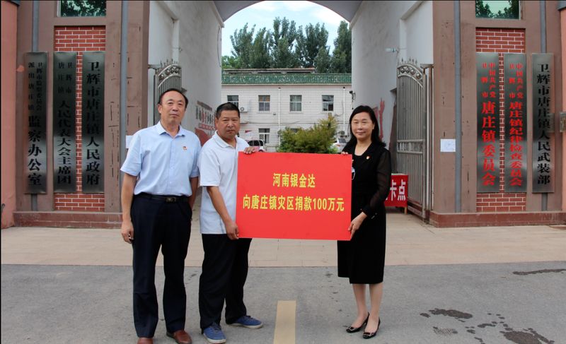 黨委書(shū)記、董事長(zhǎng)閆銀鳳代表河南銀金達(dá)集團(tuán)向唐莊鎮(zhèn)人民政府捐資100萬(wàn)元;
